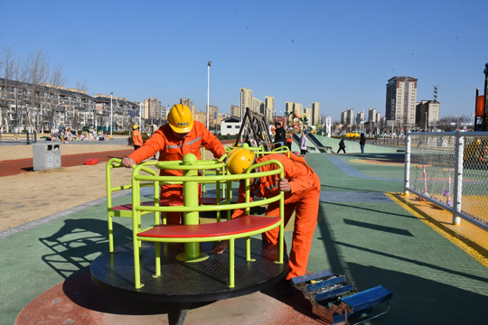 在公園廣場里,秩序井然,工作人員一絲不茍地對(duì)游樂健身設(shè)施進(jìn)行全方位檢查,“不遺漏”任何一顆螺絲、一根繩子,確保設(shè)施安全運(yùn)行,讓市民游客過一個(gè)“放心年”。