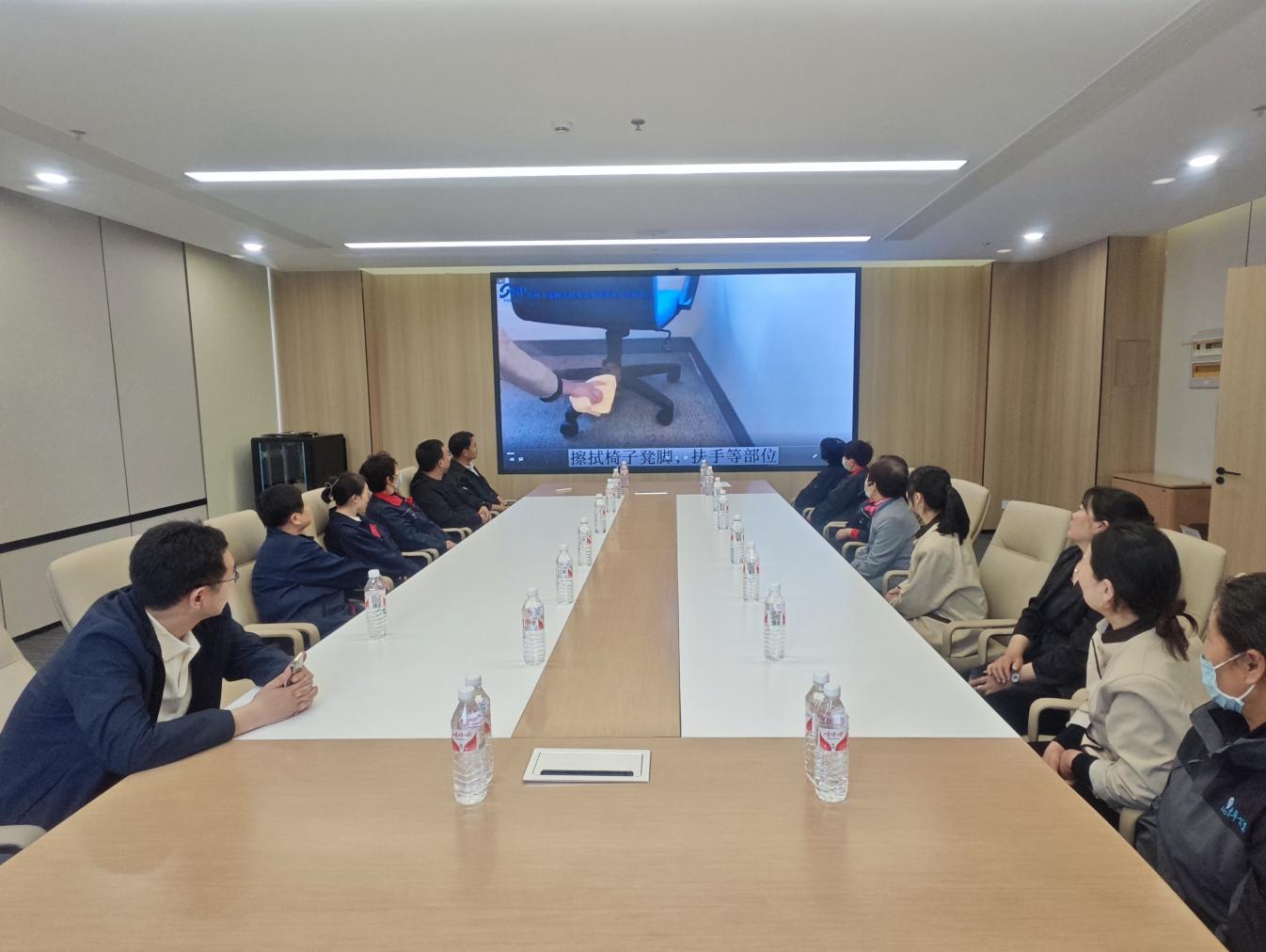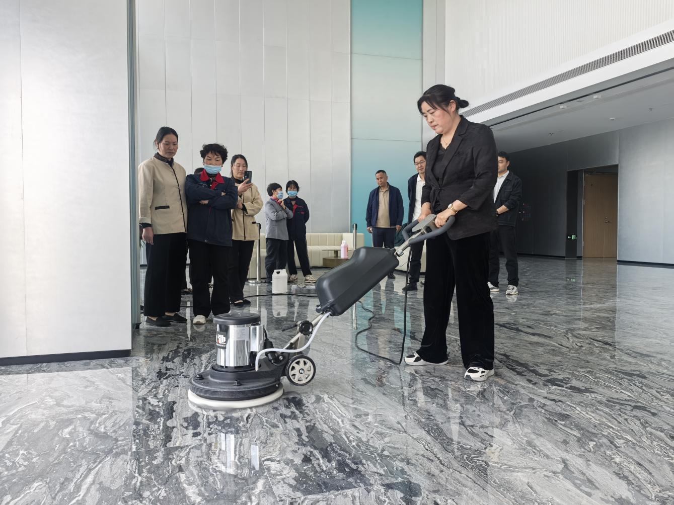 培訓(xùn)圍繞辦公大樓地面清掃、電梯轎廂清潔保養(yǎng)、玻璃幕墻清洗維護、會議室、茶水間及衛(wèi)生間細(xì)節(jié)處理到外圍路面和綠化區(qū)域的日常清理管養(yǎng)等內(nèi)容,通過觀看視頻和現(xiàn)場演示方式,詳細(xì)講解了操作規(guī)范和作業(yè)標(biāo)準(zhǔn),確保保潔人員能夠熟練掌握高效、科學(xué)的清潔技巧,提高工作質(zhì)量與效率。